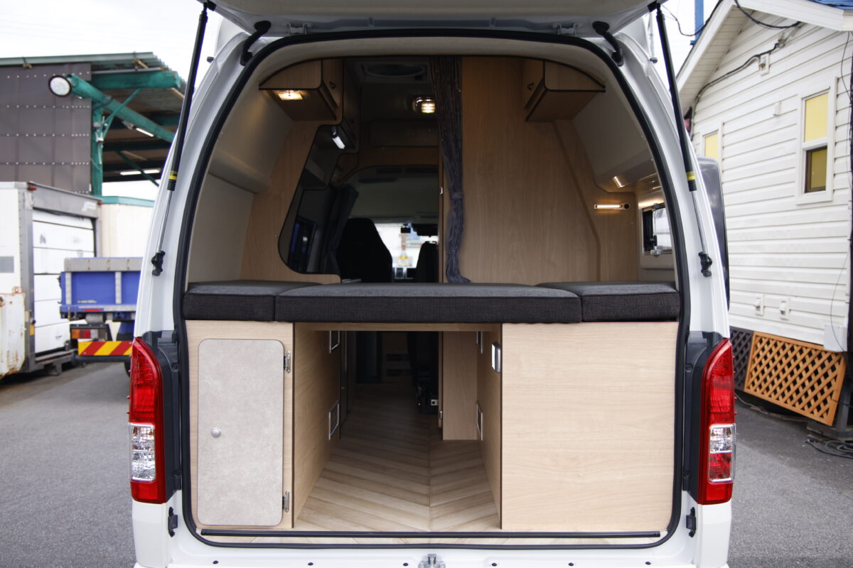 スーパーロングワイドボディのトヨタハイエース・グランドキャビンをベースに、スーパーハイルーフ架装を施し、室内高を180cm以上へ拡張。キャブコン並みの室内空間を持つ国産最大級のバンコンです。