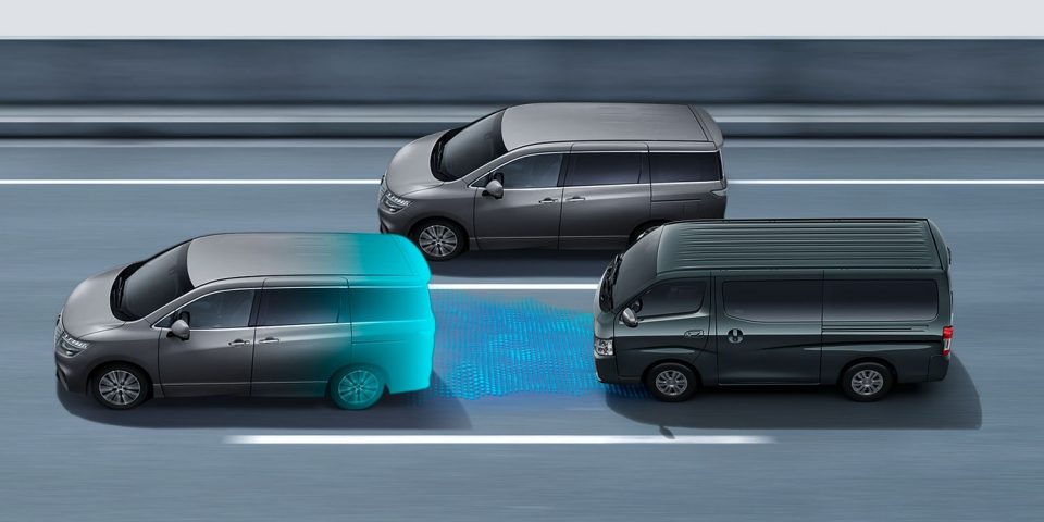 上空から見下ろしているかのような映像をナビゲーション画面やインテリジェントルームミラーに表示しスムースに駐車できます。さらに、人や自転車など周囲に動くものがいる場合に表示とブザーで注意を促します。キャラバンでは幅寄せ時に便利なサイドビューを優先表示。【グレード標準装備】